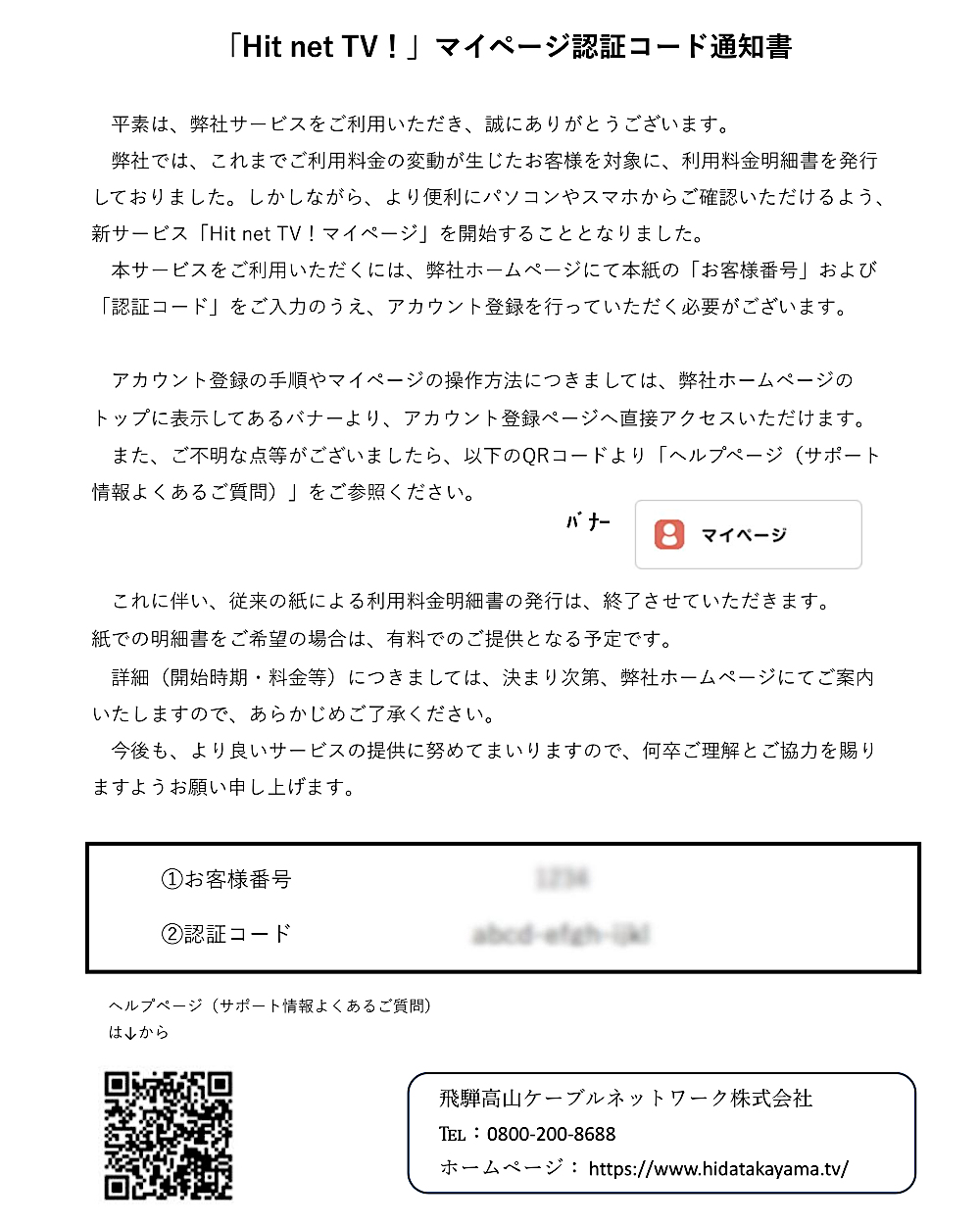 「マイページ」認証コード通知書は、郵送にてお渡ししております。