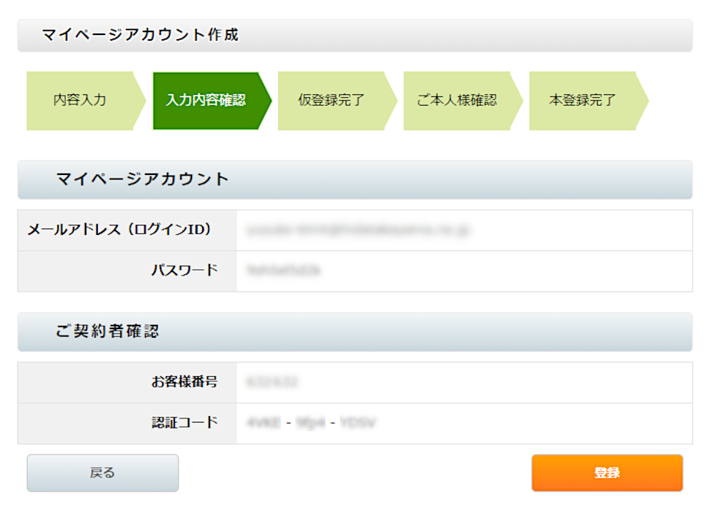 「マイページ」認証コード通知書の①お客様番号と②認証コードを確認し、新規アカウント作成ページを表示してください。